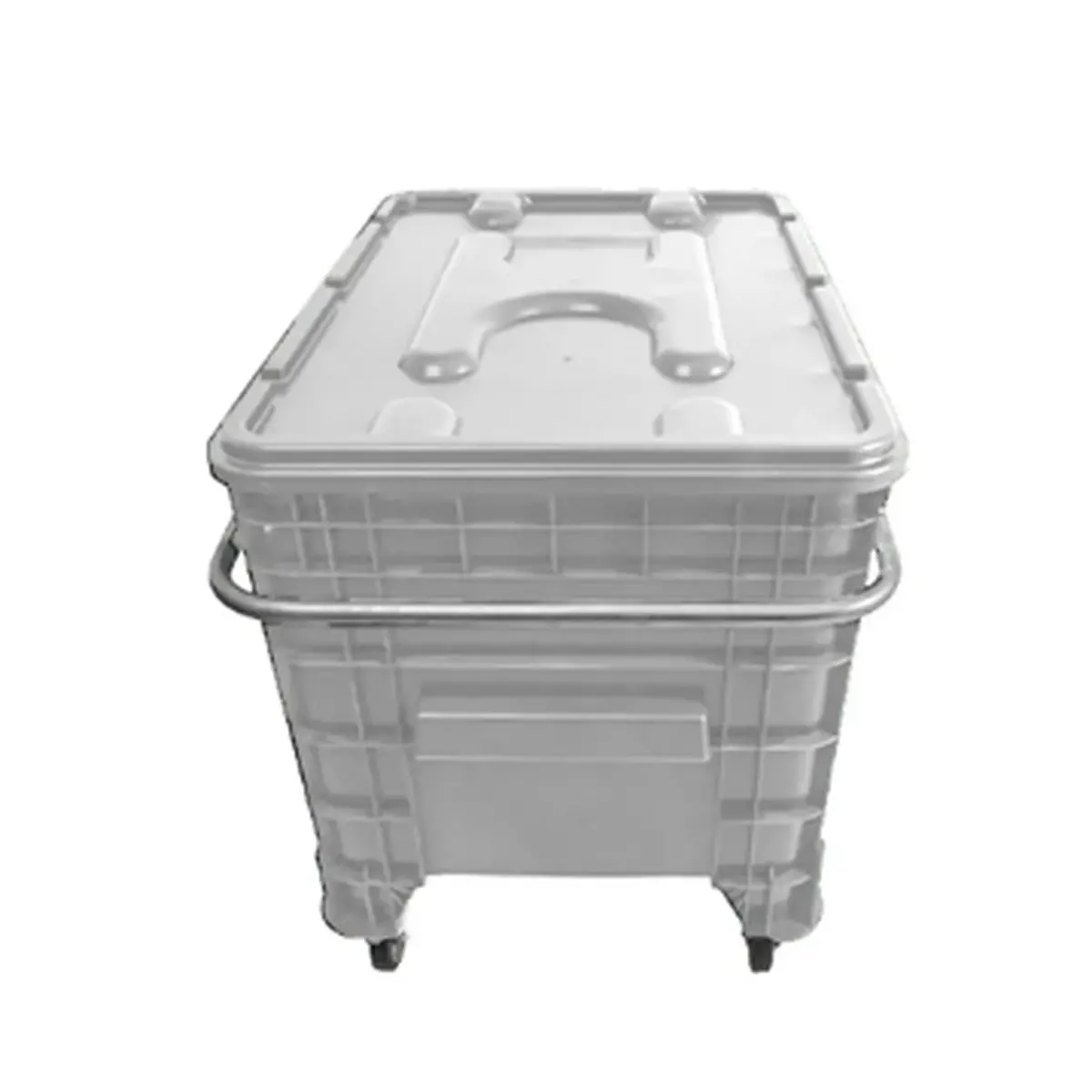 Conta com tampa com encaixe para empilhamento, frisos que evitam o acúmulo de água, puxador lateral ergonômico e 4 rodízios reforçados — sendo 2 fixos e 2 giratórios — que facilitam a locomoção mesmo quando totalmente carregada.