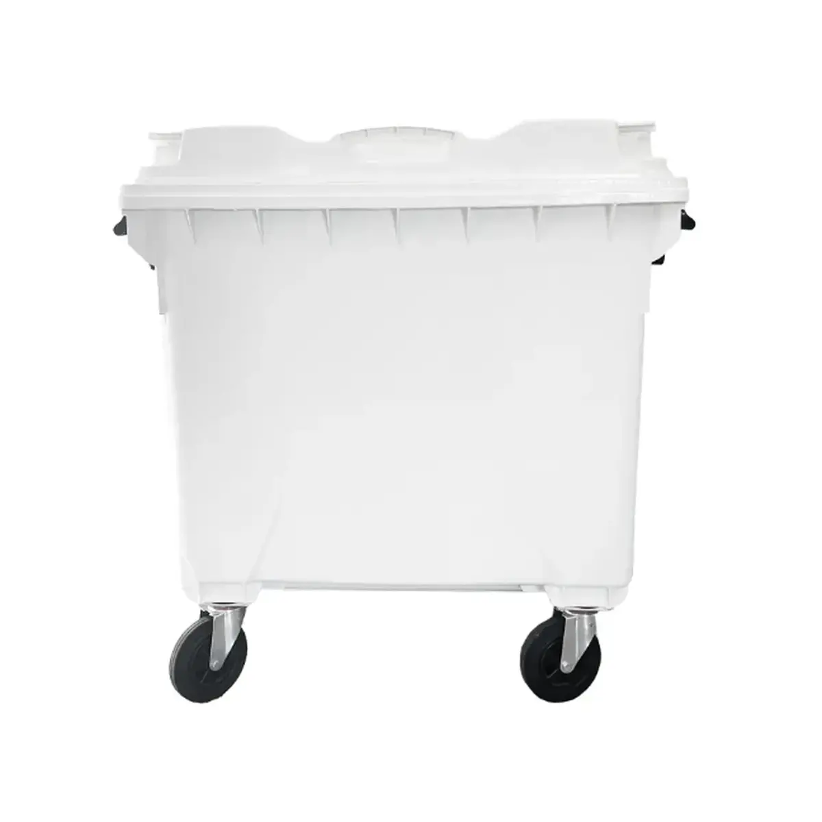 Container de lixo com capacidade de 1000 litros, fabricado em polietileno de alta densidade (PEAD) ou polipropileno (PP), oferecendo alta resistência, durabilidade e segurança.